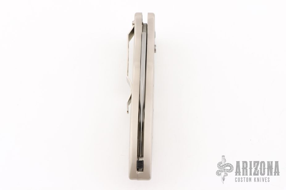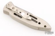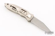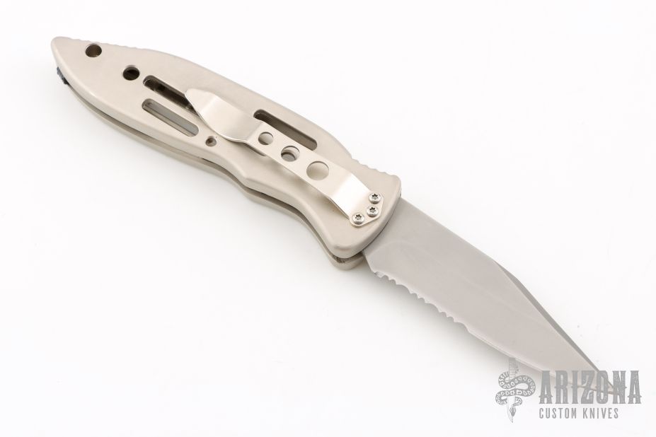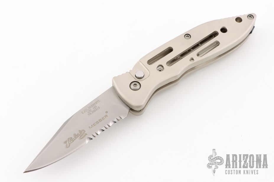 This auto by C Jul Herbertz features a bead blasted partially serrated blade. The handle has a silver coated aluminum frame with a tip down stainless steel clip. Has some light scuffs, otherwise excellent condition.