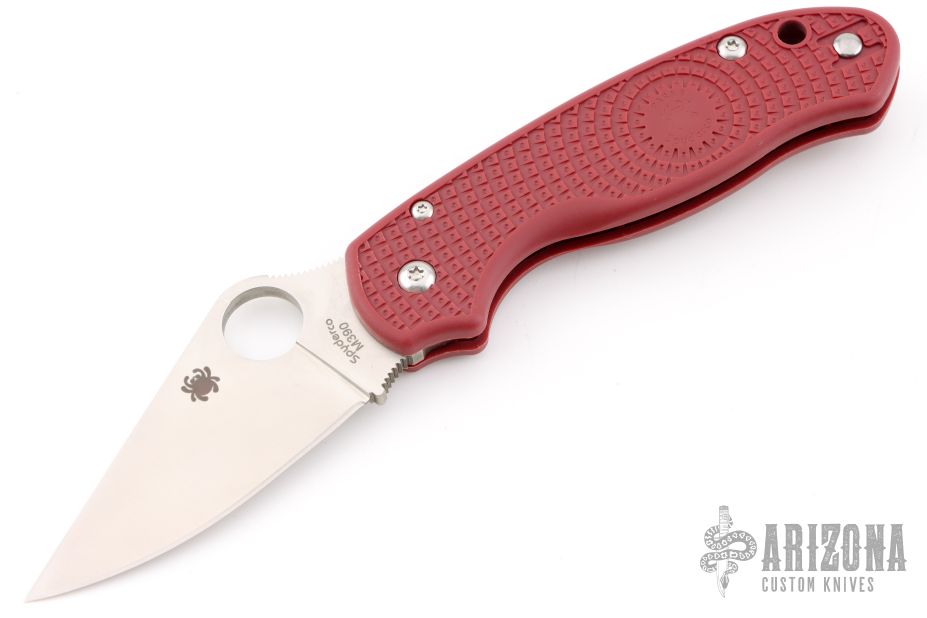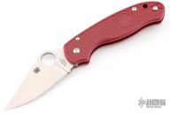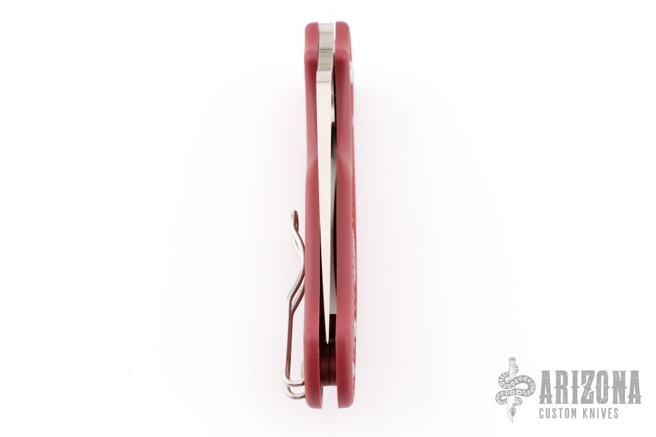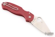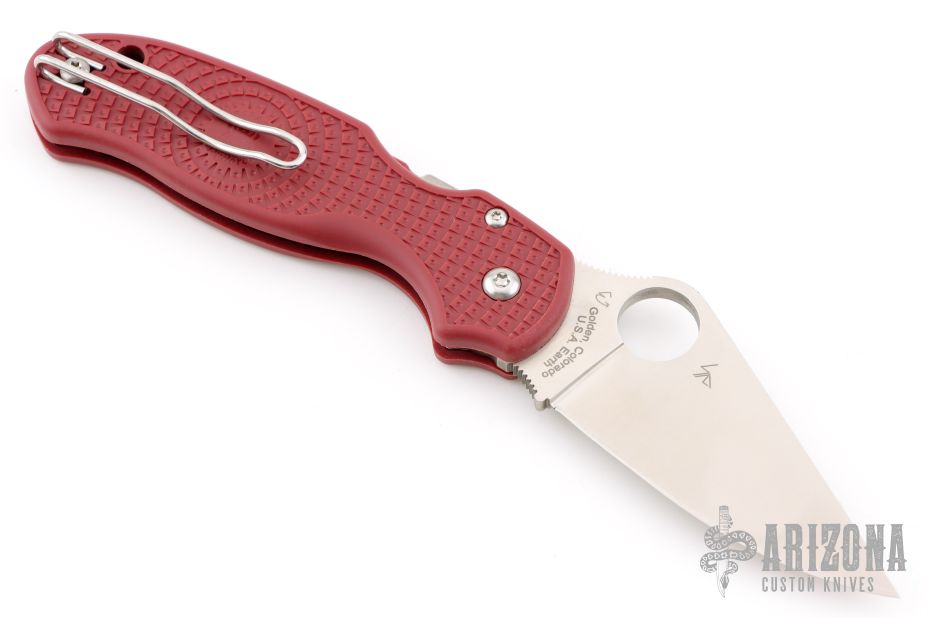 This Para 3 by Spyderco Knives features a satin finished blade with a thumbhole and notched thumbrest. The handle features red FRN scales and a steel tip up pocket clip. Includes the original box and papers. New Condition.