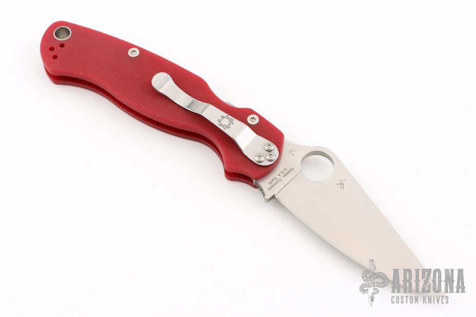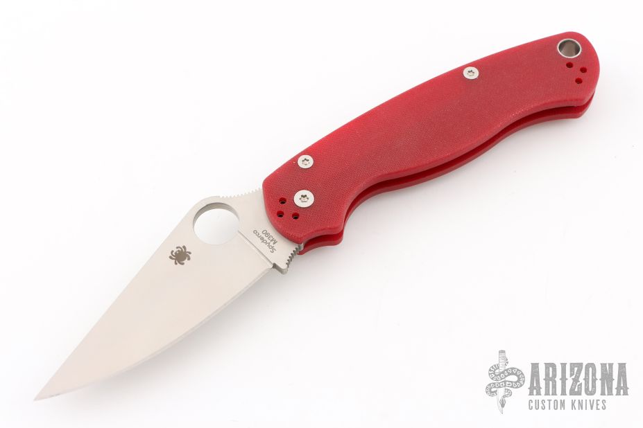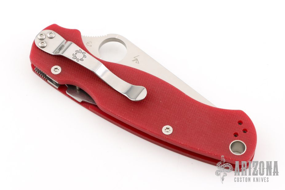 This Paramilitary 2 Linerlock Folder has a satin M390 stainless steel clip point blade with thumb hole and notched thumb rest. Handle is textured red G10 with stainless steel liners and stainless steel 4-way reversible clip. Comes with original box and papers. New condition.