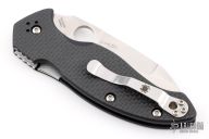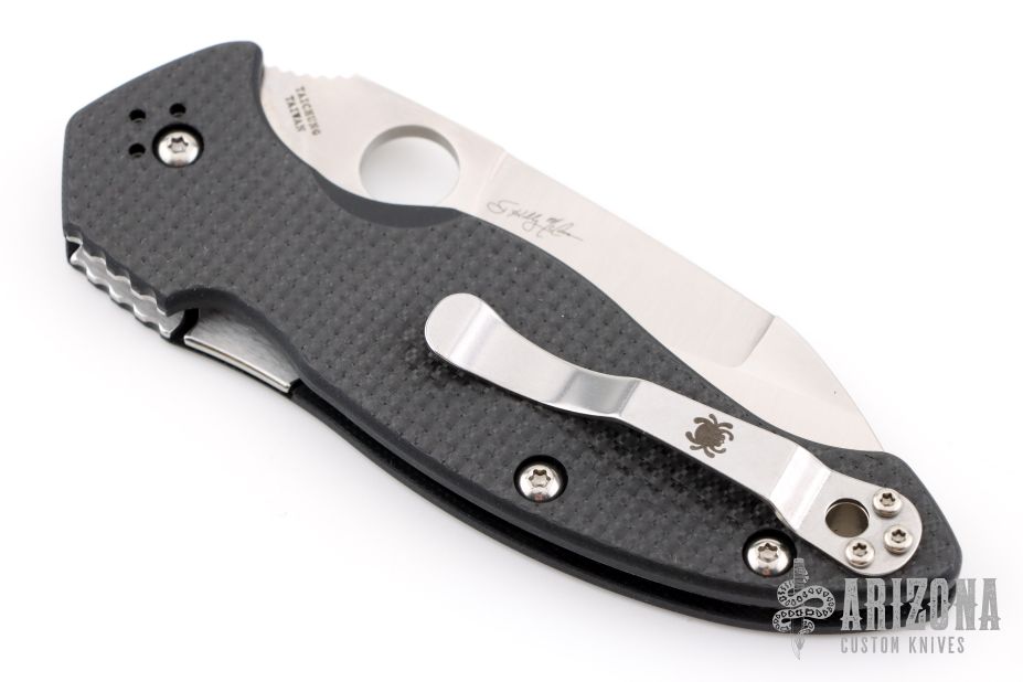 The Canis from Spyderco is a spectacle of a knife designed for everyday carry. The blade is made of CPM-S30V, and features a truly unique blade profile and grind. It has a Wharncliffe shape, a flat grind, and a ground out section which reduces weight, but full spine thickness near the tip to reinforce it. The handle is made of a carbon fiber/G-10 laminate with a gentle texture to hold it nicely in the hand.