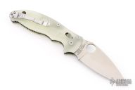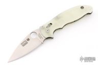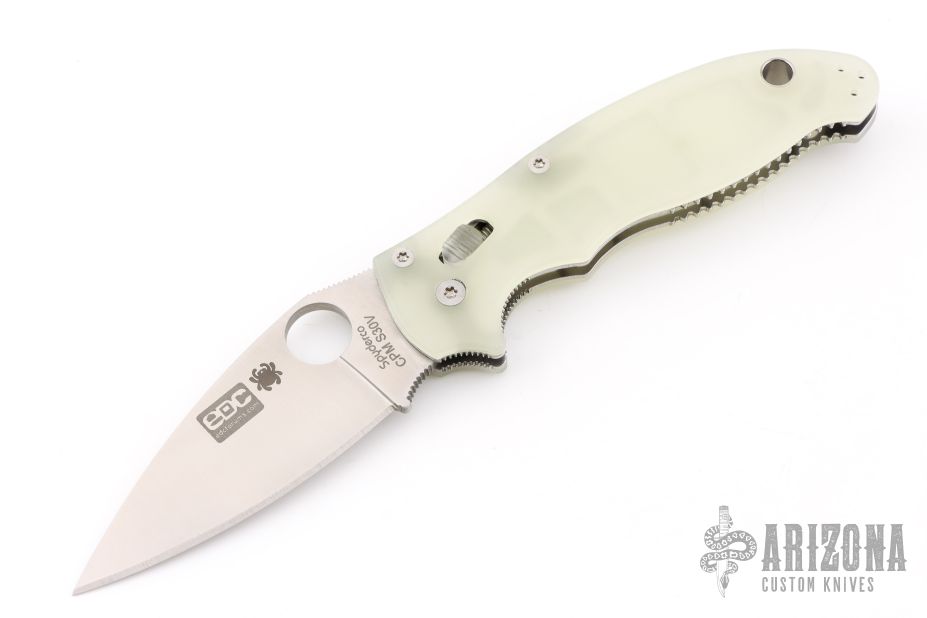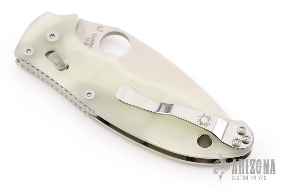 This axis-lock Manix 2 Moonglow from Spyderco features a satin finish, plain edged blade with SpyderHole and notched thumb-rest. Contoured glow-in-the-dark MoonGlow scales, stainless steel liners and back-spacer. Three screw stainless steel pocket clip is adjustable for ambidextrous left or right hand carry. The blade is stamped "EDCFORUMS.COM". Comes with original box and papers. New condition.