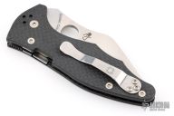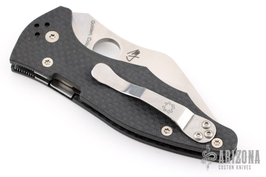 This Yojimbo 2 Linerlock Folder by Spyderco Knives has a satin finished CPM S90V wharncliffe blade with thumbhole. Handle is carbon fiber with single liner (top-side lock), and 4-way reversible black titanium clip. Comes with original box and papers. New condition.
