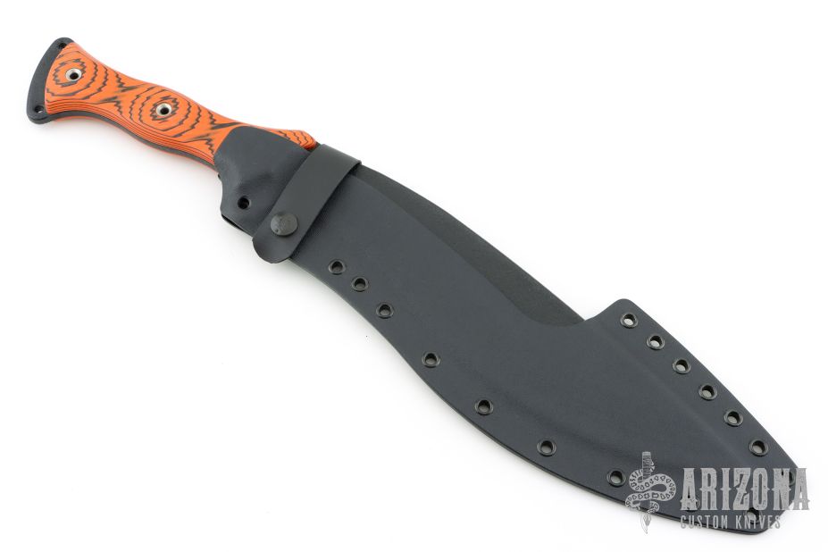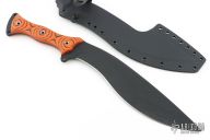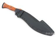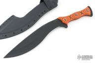 This HUCK Kukuri from the Busse features a black coated corrugated bevel blade with false top edge, .232" blade stock, 2.568" blade depth at its widest point. Full tang construction with black/ornage G-10 scales, and tube pins. Comes with a custom kydex sheath by Buy Brown. Excellent condition.