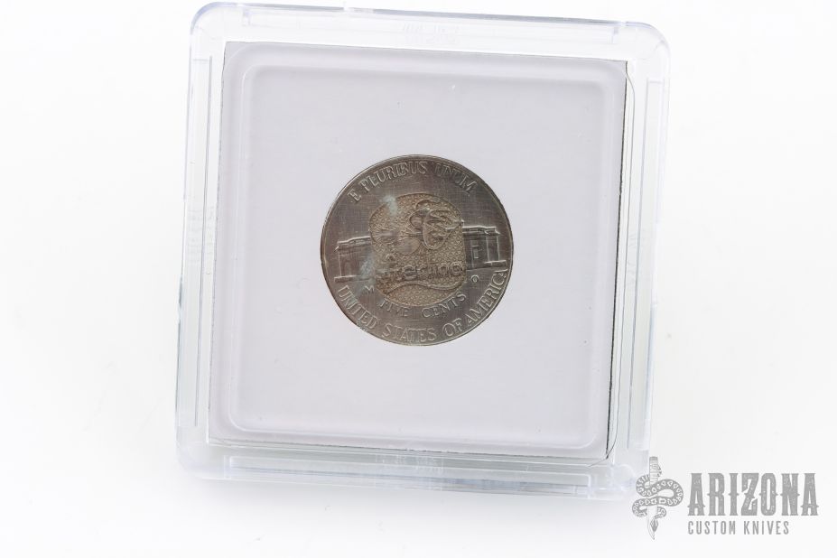 This sole authorship "Hobo Nickel" coin was created by Tom Sterling using a unique combination of advanced technologies and ancient hand engraving and carving methods.  Techniques include state-of-the-art laser engraving, and hand carving and hand engraving, each method carefully chosen for its own best effect.  Carved with a hatchling baby sea turtles theme with 6 hand engraved 24 karat gold inlaid eyes, from a US 2001P 5 cent coin. Comes with COA. One of an Edition of three. New from maker!