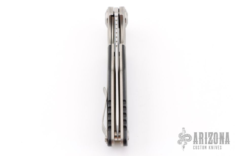 This Warrior liner lock flipper by Eddie Baca is a Liong Mah design, it features a hand rub satin finished blade with notched thumb rest. The handle has orange peel finished titanium bolsters, carbon fiber scales, orange peel finished titanium liners, titanium post, and tip up clip. Has nice detent, lockup and blade seating. Smooth flipping action. Excellent condition.