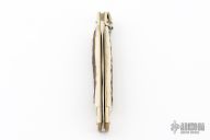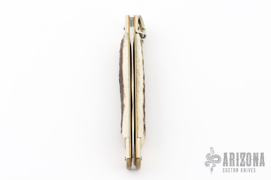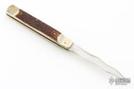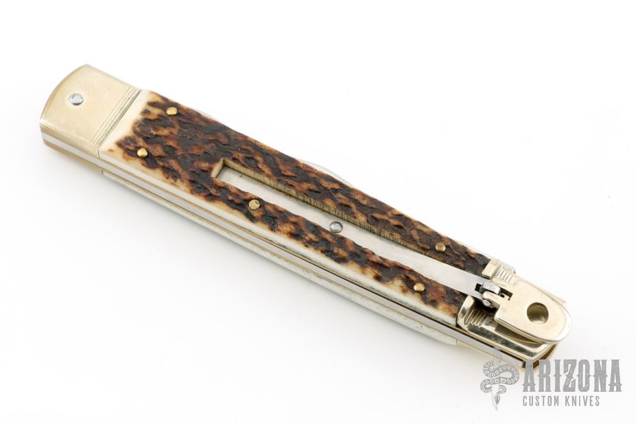 This leverlock auto by Hubertus features a mirror polished Kris style blade, edges are unsharpened, nickel silver double bolsters, stag scales, and brass liners and pins. Opens with a nice snap. Has some light scratches, otherwise excellent condition.