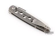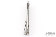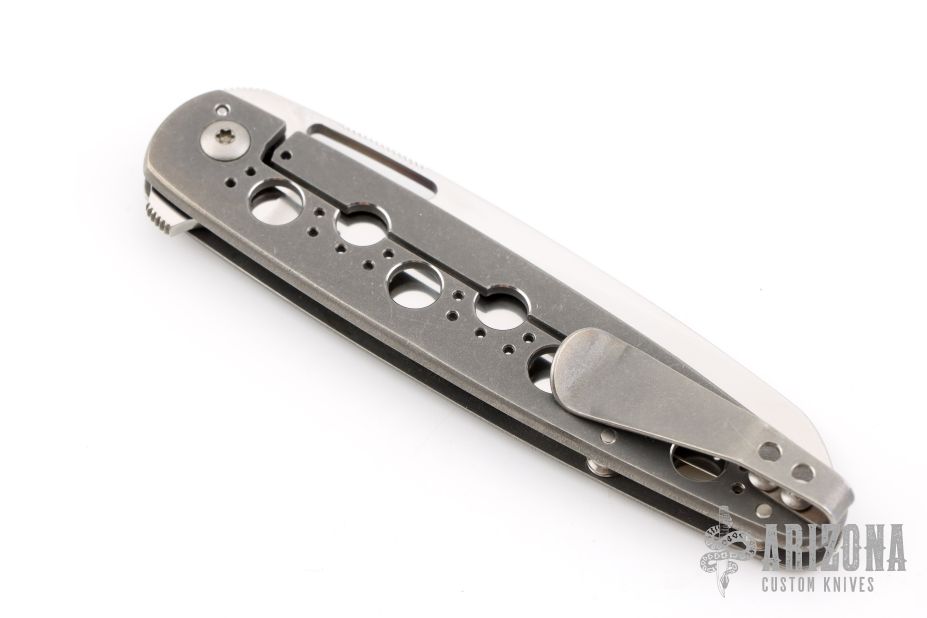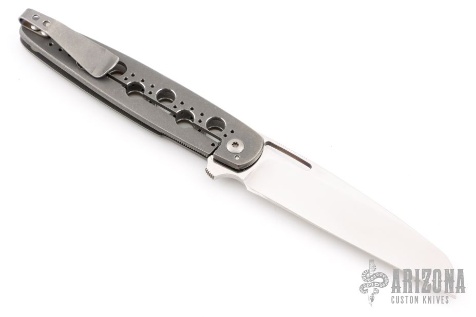 This Framelock flipper by Brad Zinker features a hand rub satin/polished sheepsfoot blade with notched thumbrest and flipper. The handle has a stonewashed titanium frame with matching tip up titanium clip. Nice detent, blade seating and lock up. Has scuffs and scratches throughout, good condition otherwise. Great user condition.