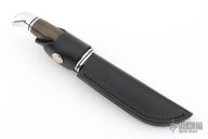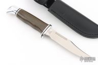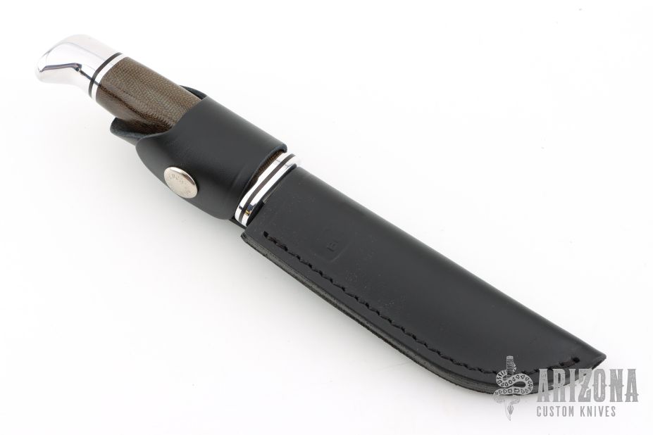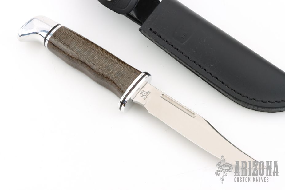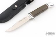This Model 117 Brahma by Buck Knives features a satin finished clip point blade with false top edge and fullers, .118" blade stock and .787" blade depth, hidden tang construction. The handle has an aluminum guard and butt, and a green canvas micarta grip. Comes with original black leather sheath. Excellent condition.  Coems with original box and papers.