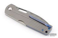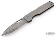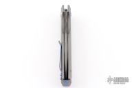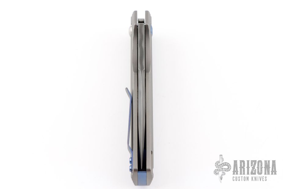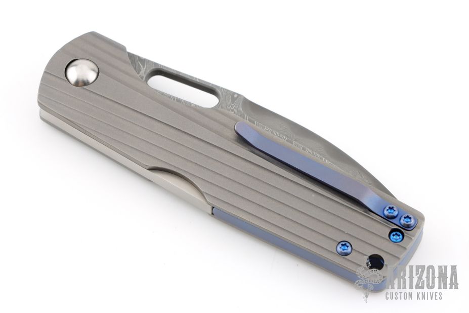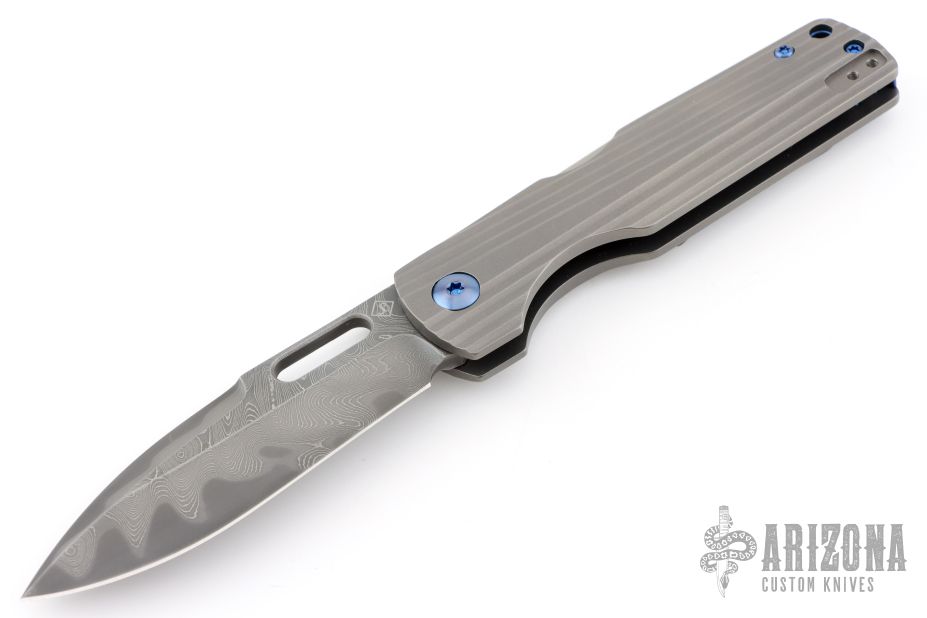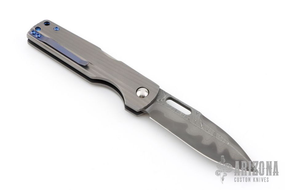 This Mid-lock by Jim Burke features a Chad Nichols Stainless Steel Damascus blade with thumbhole. The handle has a blast finished titanium frame with milling pattern, anodized tip up titanium clip, titanium backspacer, bead blast finished stainless steel lockbar. Excellent condition.
