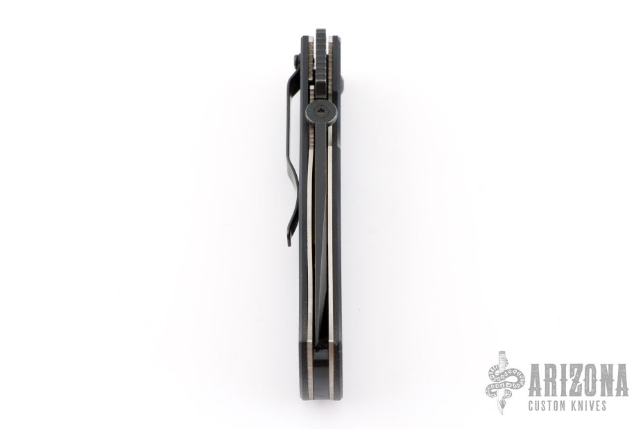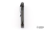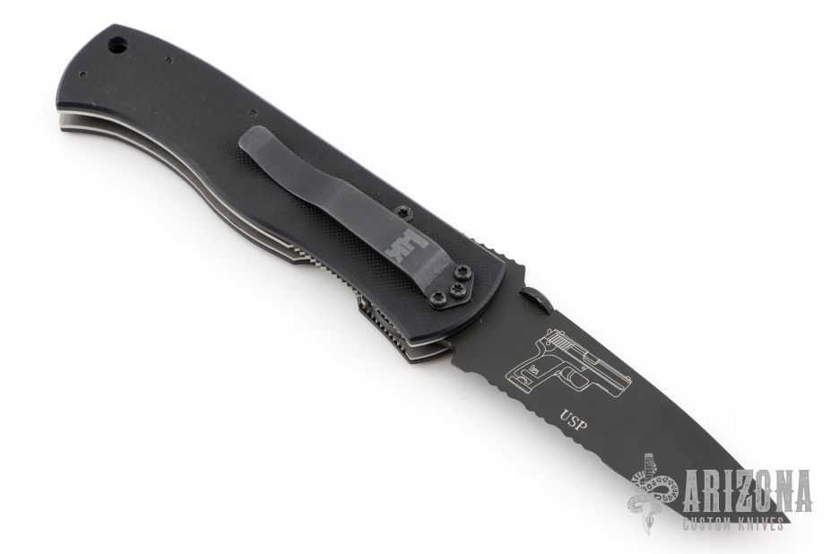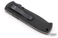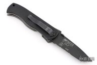 This Benchmade/Emerson Collab CQC7 970SBT features a drop point, tanto style, chisel ground, black coated blade with false top edge, thumb disc and notched thumb ramp. Black G10 scales over titanium liners and black backspacer. Has holes for a tip down pocket clip, has lanyard hole in pommel. Excellent condition.