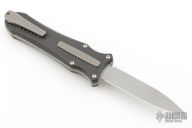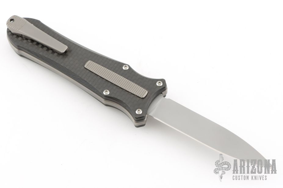 This knife is a Deadlock Model B. It has a single-edged bead blasted blade. The handle has a carbon fiber and bead blasted titanium frame with a tip down spring clip, stonewashed titanium. The thumb slide on the handle is also titanium and handle has titanium overlays. Grant and Gavin Hawk set out to create a double action OTF with no blade play.... They did it, NO blade play. Comes in a soft pouch with original card and tools. Excellent condition.