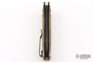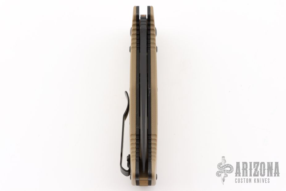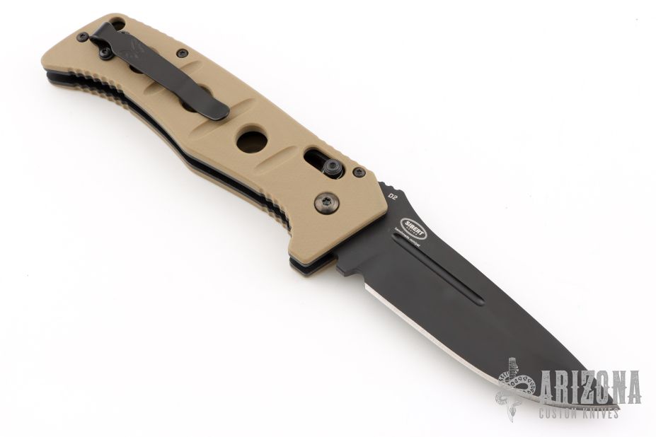 This Siebert designed 2750BKSN Adamas Auto Axis Lock has a black coated D2 stainless steel drop point blade with fullers and notched thumbrest. Handle is tan G-10 over black stainless steel liners, tan G10 spacer, reversible tip up black stainless steel clip, and spine safety button. Includes tan nylon sheath. Comes with original box and papers. Excellent condition.