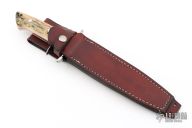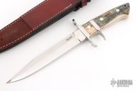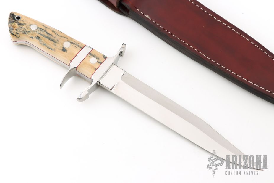 This Sub-Hilt Fighter by Charles Vestal features a mirror polished blade with sharpened top edge, .272" blade stock, 1.198" blade depth, full tapered tang. The handle has a mirror polished stainless steel guard, mammoth ivory scales with red liners. Comes with a brown leather sheath. Excellent condition.