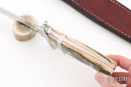 I have been making knives since 1992 and have concentrated on Loveless style knives since buying the book "How To Make Knives" early in my knife making. Over the years I have worked hard to improve the fit and finish of the knives that I make and I hope to continue to improve. In the years to come I hope to come up with new designs and start making a few folding knives. I would like to thank Steve Johnson and Mike Lovett for their willingness to share their knife making knowledge. I have been using CPM-154 for my main blade steel the last couple of years. I like the way it finishes and it makes a fine knife. I entrust Paul Bos with the heat treatment of my knives. Paul heat treats my CPM-154 blades to 60-61 RC. The standard Vestal knife will have a stainless guard or bolsters and stainless bolts or pins. I like to use natural handle materials for the handle scales but if your knife is going to see hard use, I will be glad to put Micarta or another synthetic on the knife.