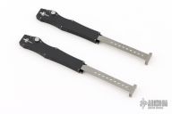 This set of Mini Halo IIIs by Marfione Custom Knives both feature black aluminum frames with double vapor blasted titanium charging handles and hardware. One of them has a mirror polished Star Grind tanto blade. The other has a Vegas Forge Herringbone pattern Damascus Star Grind tanto blade. Both knives have their own individual carbon fiber box with laser engraved stainless steel escutcheon. Comes with original box, COA and zippered cases. New condition. #023 and dated 08/2021.