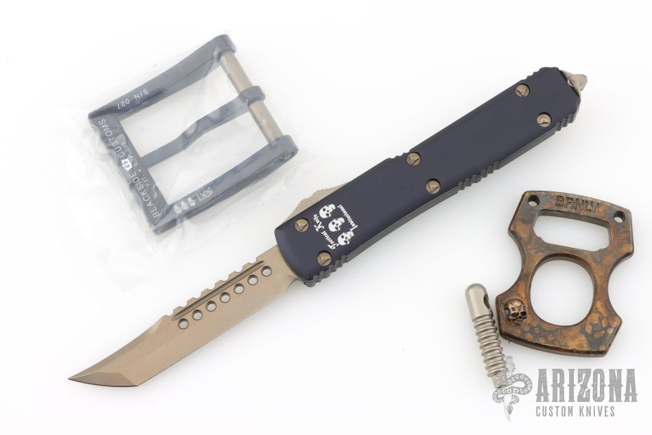 This boxed set from the 2017 Tactical Knife Invitational includes custom Hellhound ground Ultratech by Sean and Anthony Marfione, .25" Thickness "Darkness" Cypop with Steel Flame skull and Greg Stevens Design leather cypop coozie. Pocket clip and leather coozie are marked TKI. Cypop has "Steel Flame", "Tactical Knife Invitational" and the three "TKI Skulls" engraved into the "B" side of the Cypop. Also included is a Blackside Customs modular belt buckle with disassembly tool. All items are serialized with the number 027.