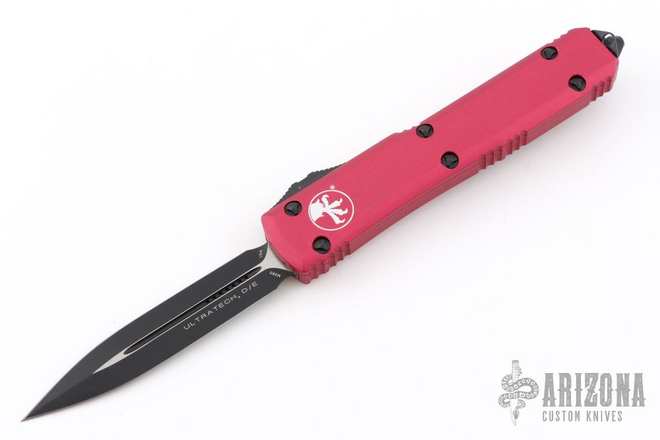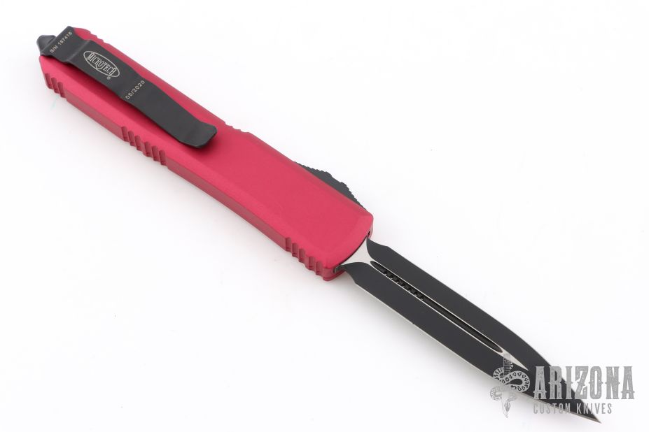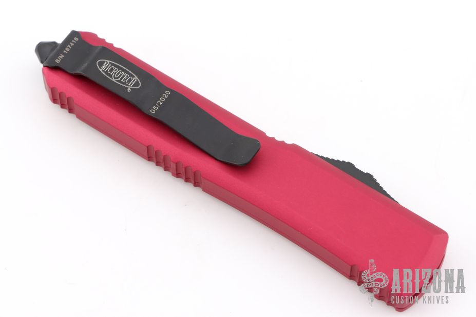 This Ultratech OTF automatic by Microtech Knives features a black D/E blade with a standard edge and a red aluminum handle. Black stainless steel clip and hardware. Glass breaker. S/N 167416 and dated 05/2020. Comes with original box and papers. Excellent condition.