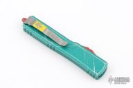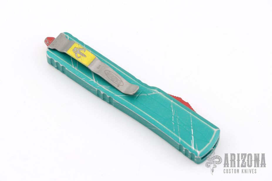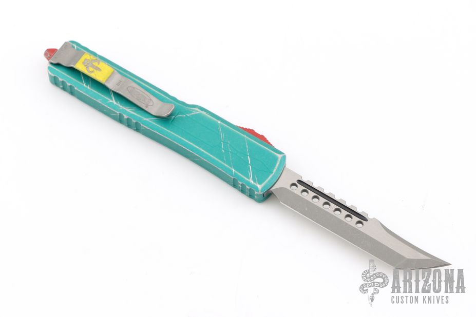 This UTX-70 OTF automatic by Microtech features an Apocalyptic finished blade with a standard edge. The handle has a distressed Bounty Hunter aluminum frame with stainless steel tip down clip. Dated 06/2023 and #1126. Comes with original box and papers. Excellent condition.