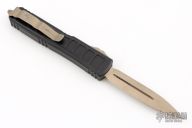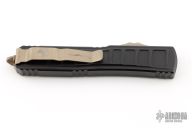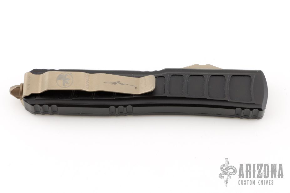 This Ultratech II by Microtech features a bronzed double edged blade. The handle has a black aluminum frame with a "stair step" design for better grip. Stainless steel tip down clip. Dated 01/2022 with s/n 450. Includes original box and papers. Excellent condition.