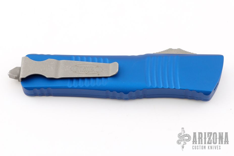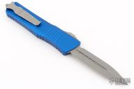 This Combat Troodon by Microtech Knives features a apocalyptic double edged blade. The handle has a blue aluminum frame with tip down blasted stainless steel clip and hardware. Comes with original box and papers. S/N 27819 and dated 04/2020. Excellent condition.