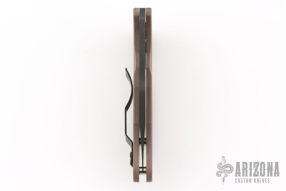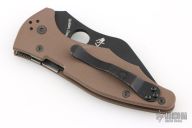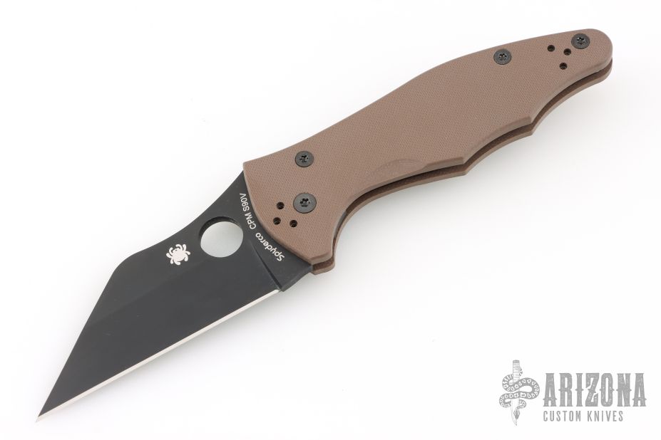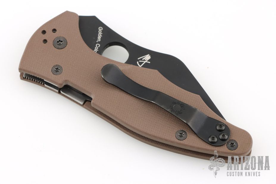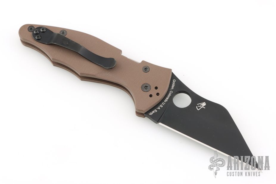 This Yojimbo 2 Folder by Spyderco Knives has a black DLC coated CPM S90V wharncliffe blade with thumbhole. Handle has brown sculpted G-10 scales with stainless steel liners (top-side lock), and a tip up black reversible stainless steel deep carry clip. Excellent condition. Comes with original box and papers.