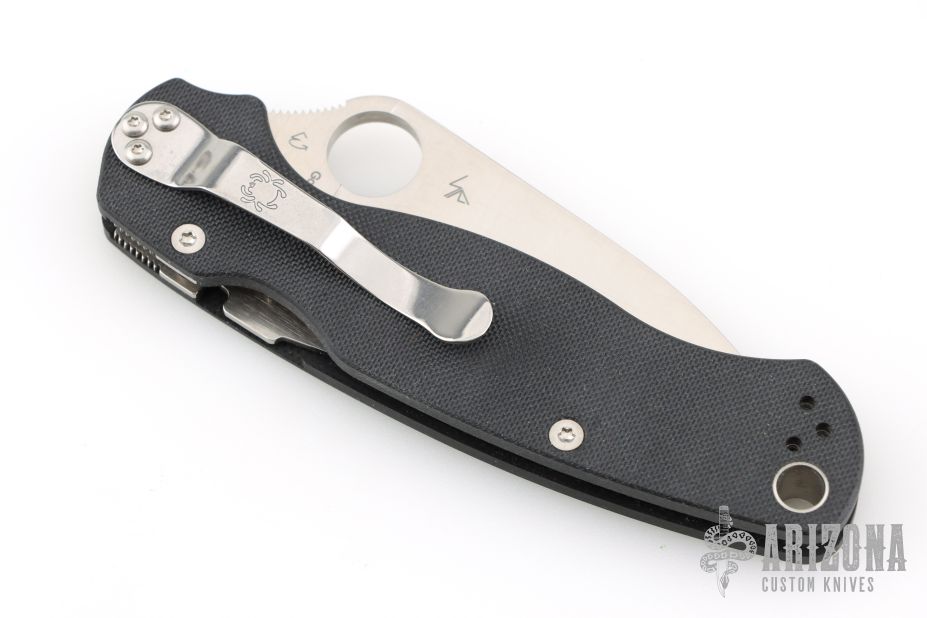 This Paramilitary 2 Liner lock Folder from Spyderco has a satin finished wharncliffe blade with thumbhole and notched thumbrest. Handle has black G-10 scales, nested stainless steel liners and stainless steel tip up clip. Comes with original box and papers. Excellent condition.