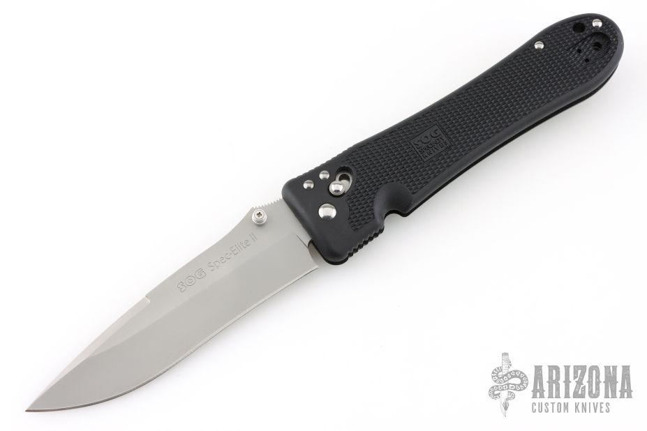 SOG Knives Spec-Elite knife series is based on the famous Pentagon Elite platform. This knife uses the Arc-Lock, which has been tested at over 1000 lbs. of pressure without failure. The Arc-Lock is fast and easy to use, whether you are left or right-handed. The durable Arc-Lock self-adjusts over the long-term for optimal performance. This piece is in excellent condition. Comes with a zippered case.