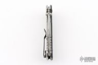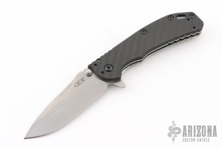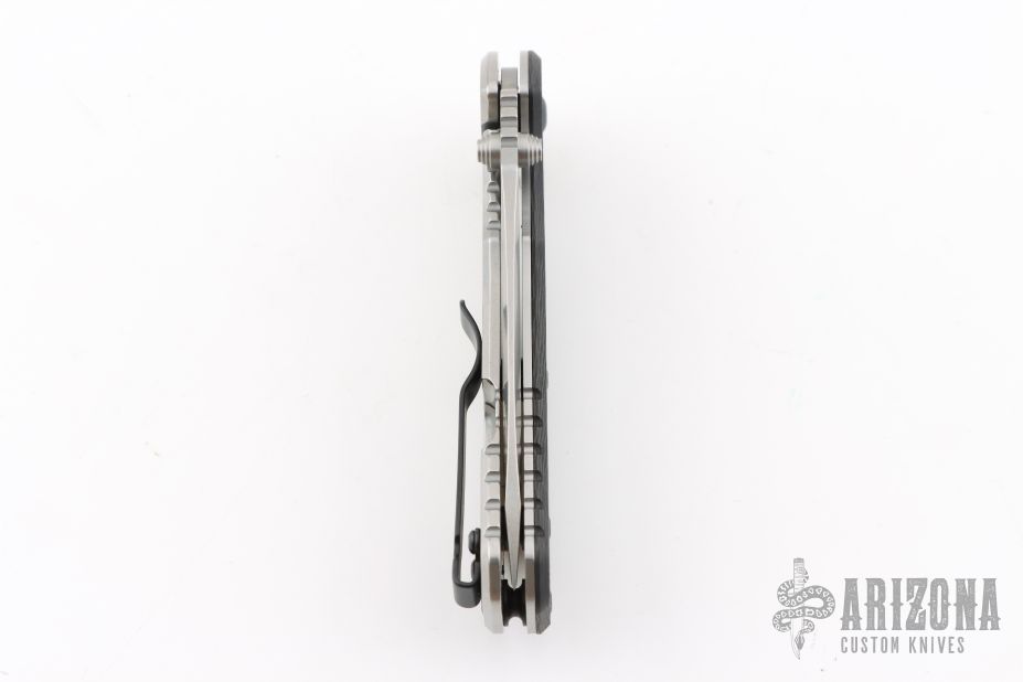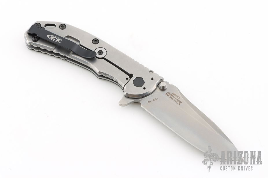 This 0566 Hinder Design Flipper by Zero Tolerance features a tumble finished drop point blade with swedge, dual thumb studs, notched thumb rest and flipper. The handle has a carbon fiber scale over a titanium liner and a tumbled titanium lockside over black barrel spacers. The black coated steel tip up clip is reversible for right or left hand carry. S/N 4931.  Excellent condition. Comes with original box and papers.