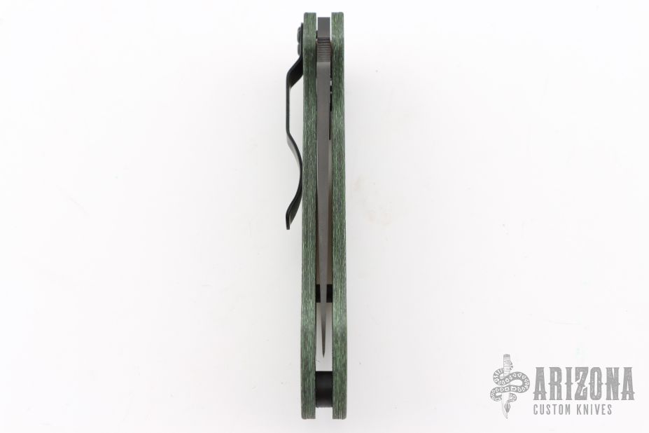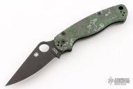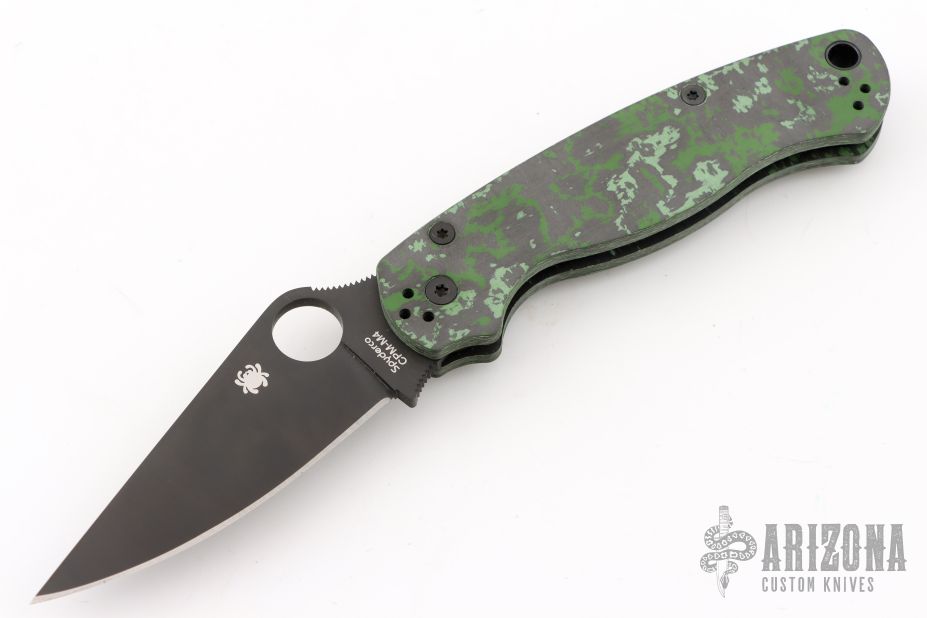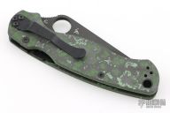 This Paramilitary 2 Linerlock Folder from Spyderco has a black finished clip point blade with thumb hole and notched thumb rest. Handle has black/green Fat Carbon scales with stainless steel liners and stainless steel 4-way reversible clip. Comes with original box and papers. Excellent condition.