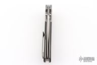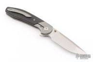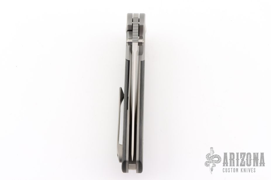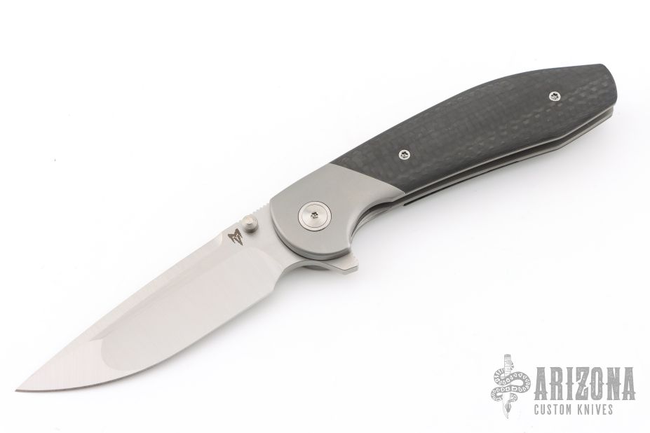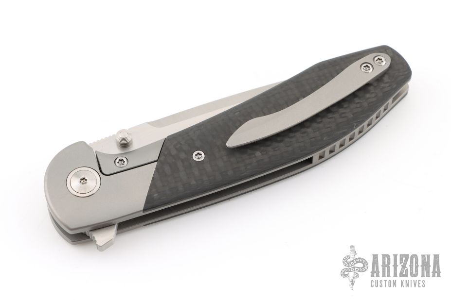 This VBR by Reate is a Mark Varga design, it features a satin finished blade with flipper. The handle has a bead blast finished titanium frame with carbon fiber scales, bead blasted titanium backspacer and tip up clip. Rides on ceramic bearings. Comes with original box and zipper case. Excellent condition.