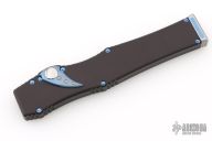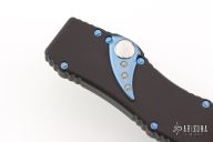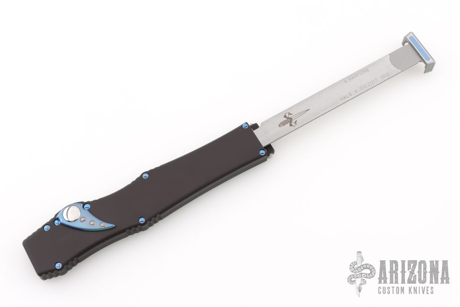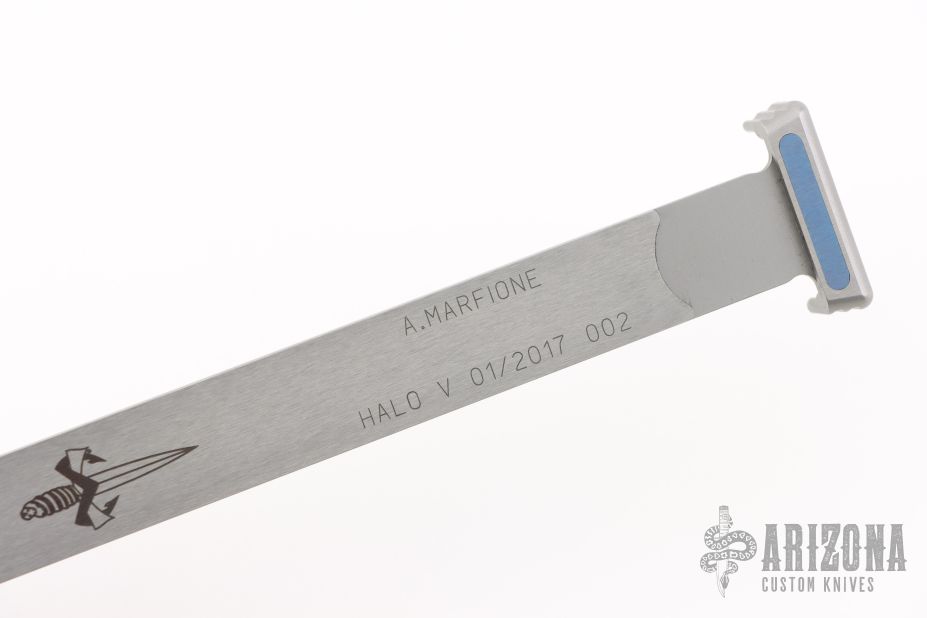 This Halo V by Marfione Custom Knives features a mirror polished blade with satin finished flats. The handle has black anodization, with blue anodized face plate around the mirror finished button, and blue hardware. Charging handle is stonewashed stainless steel dated 01/2017 s/n 002. Comes with a nylon zippered case and original box. Excellent condition.