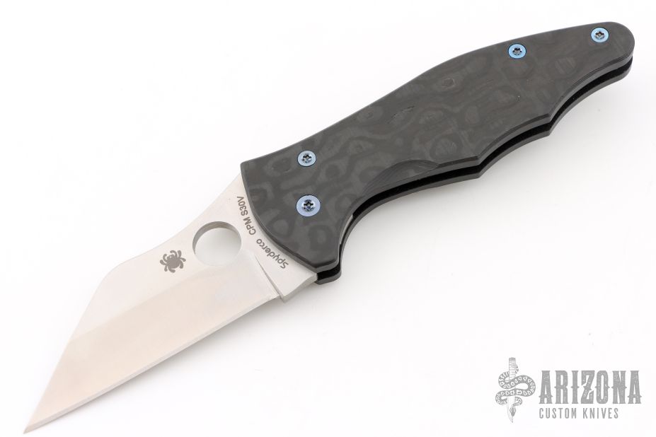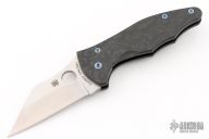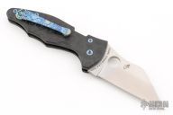 This Yojimbo 2 by Spyderco features a satin finished wharncliffe blade with thumbhole, has an added wave feature opening thumbstud. The handle has Flytanium raindrop carbon fiber scales, stainless steel liners, lock is on the spine of handle. Anodized titanium screws. Custom laser engraved titanium clip. Nice detent, lockup and blade seating. Comes with a Spyderco box and papers. Excellent condition.
