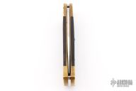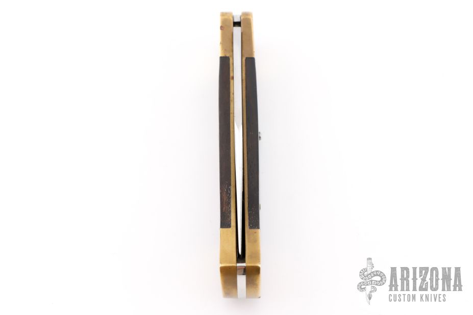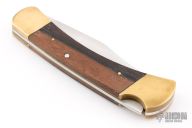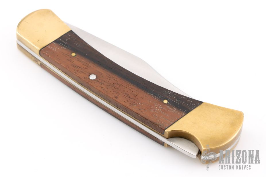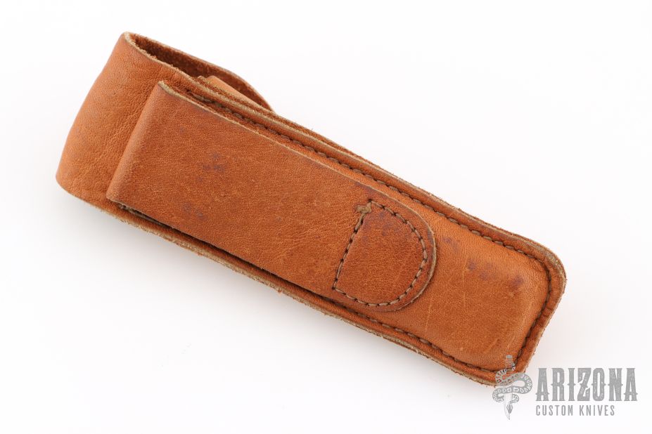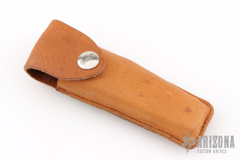 This vintage Buck 110 "folding hunter" features a satin finished clip point blade with nail nick. It has wood scales, brass bolsters and frame. Comes with original leather sheath. Has some patina and scratches, has been resharpened. Great overall condition otherwise.