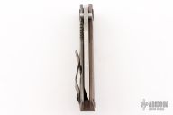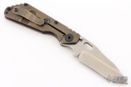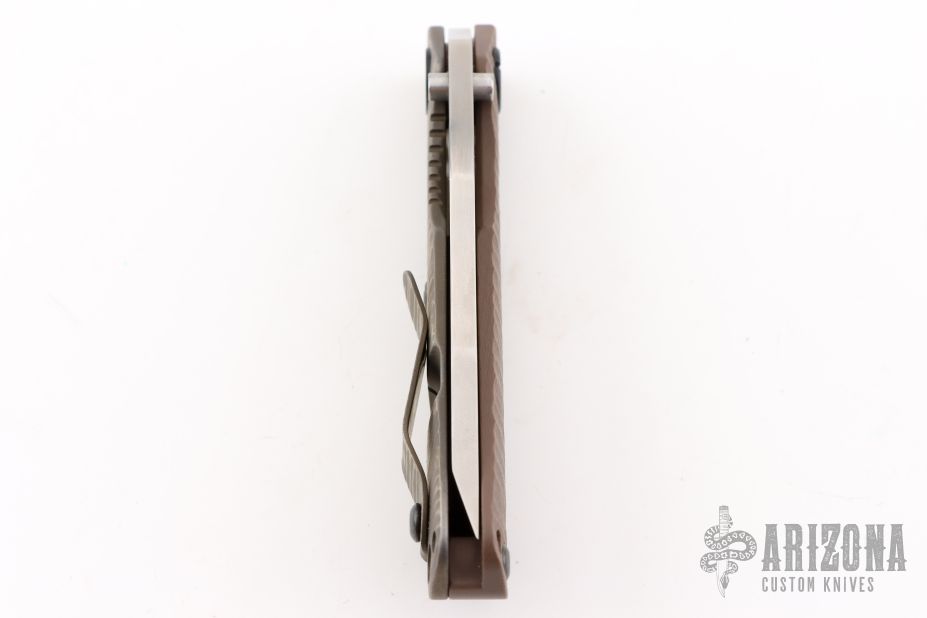 This DDC SNG by Duane Dwyer features a drop point chisel ground blade with thumbhole, and dual thumbstuds. The handle has a textured brown G-10 scale and a textured and anodized titanium frame with an anodized tip up clip. Has some light scratches on the blade and handle otherwise excellent condition.