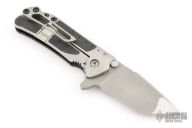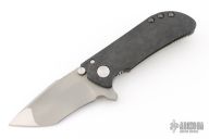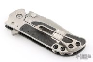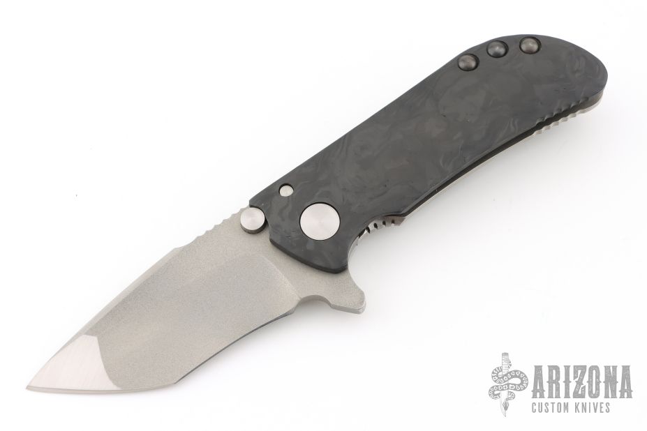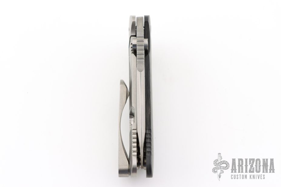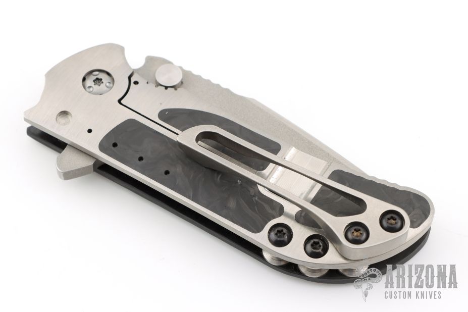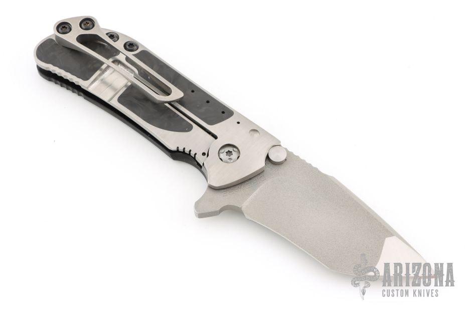 This M8 Flipper by Direware Custom Knives features a two tone tanto blade with swedge, notched thumbrest, and flipper. The handle has a marble carbon fiber and satin finished titanium frame with marble carbon fiber inlays, orange peel finished titanium clip is positioned for right hand, tip up carry. Great blade seating, detent and lock up. Knife is in excellent condition.