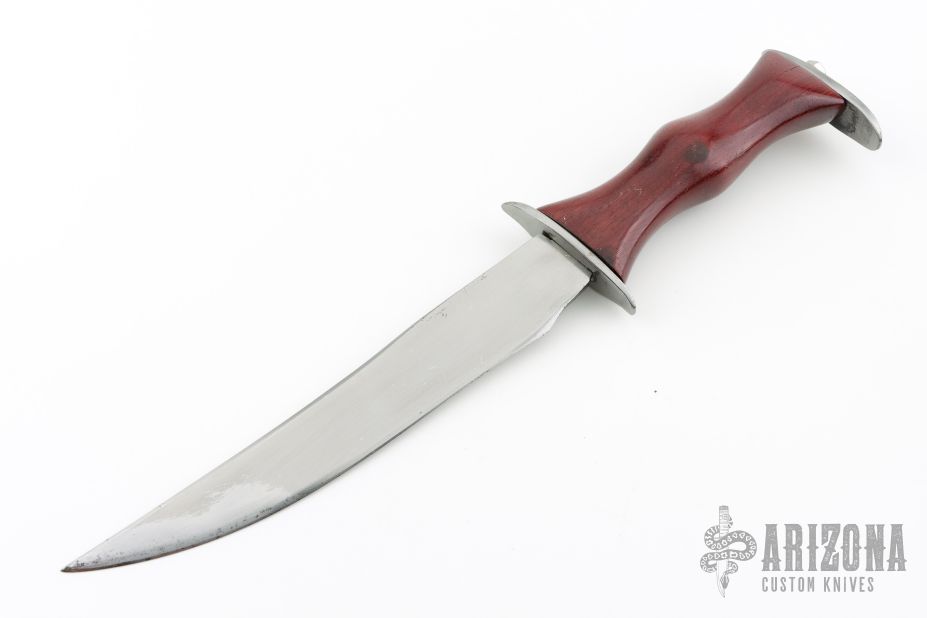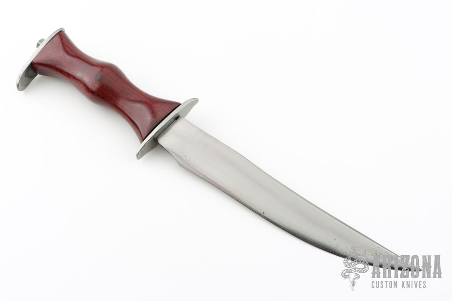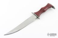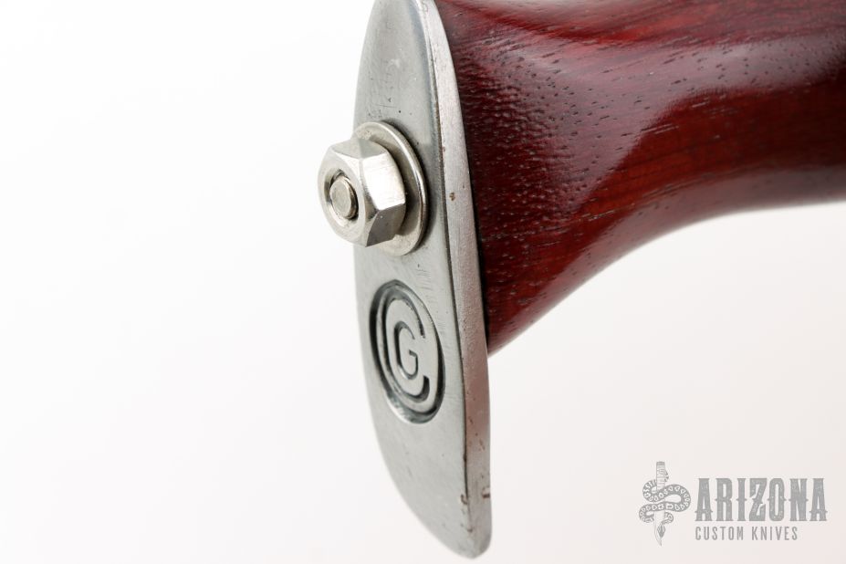 This knife by Gary Cooper features a satin polished blade with .236" blade stock and 1.469" blade depth, hidden tang construction. The handle has a steel guard and butt with sculpted wood grip. Has some light scratches, some patina and a few spots on the blade. Great condition otherwise.