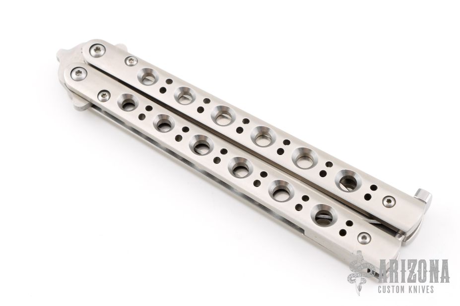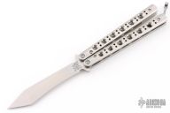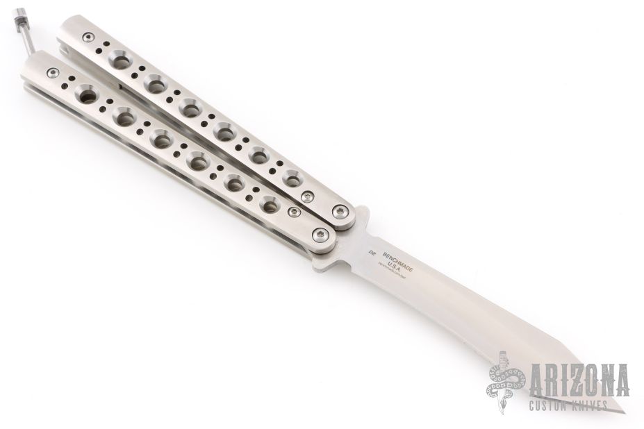 This Model 67 Balisong by Benchmade features a tumble finished tanto recurve blade and stainless handles with T-latch. Nice and tight. Comes with original box and papers. Has a couple light scuffs, otherwise. Excellent condition.