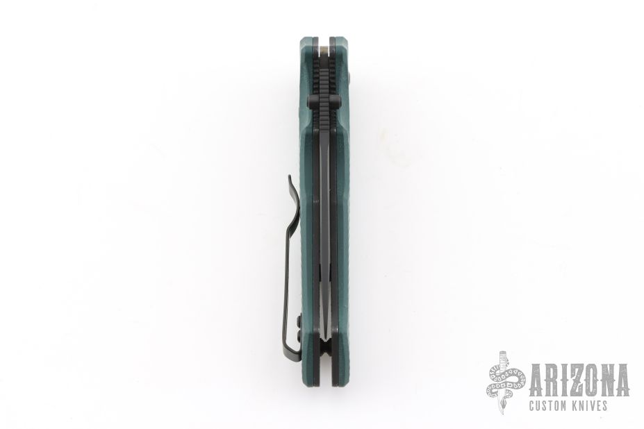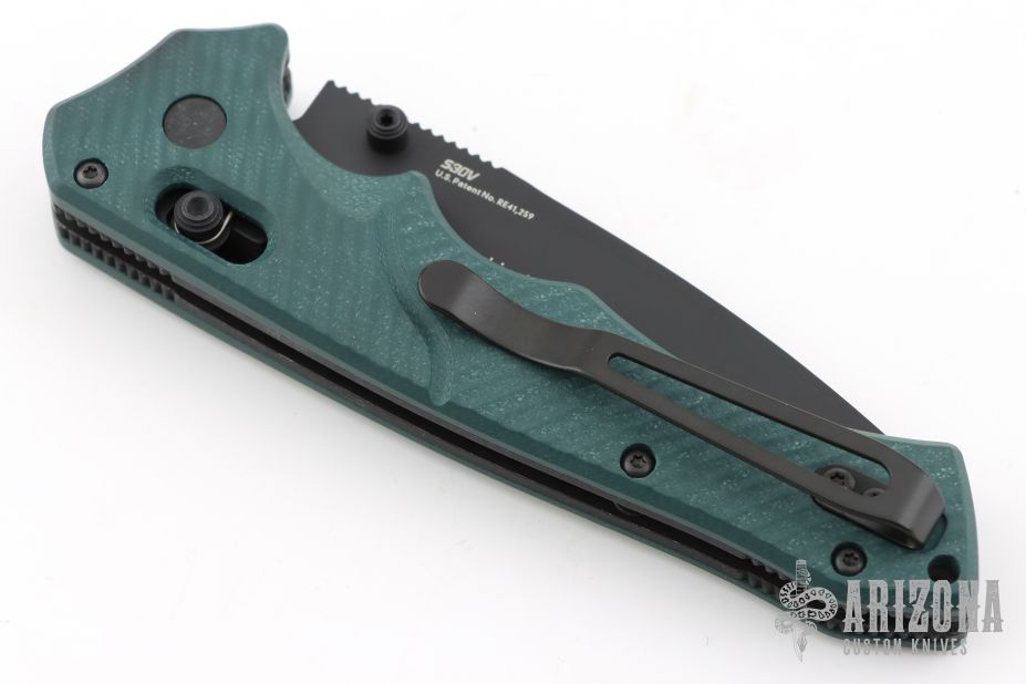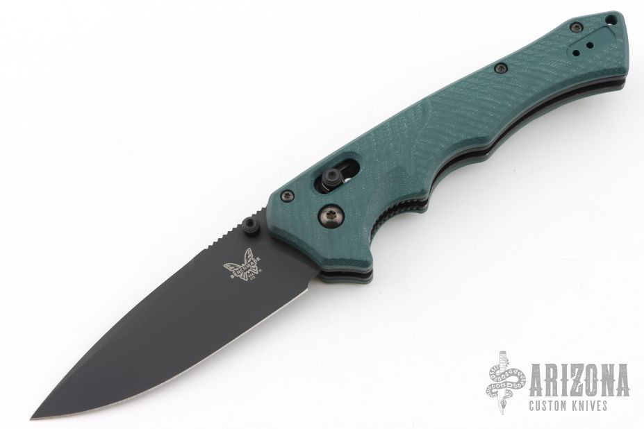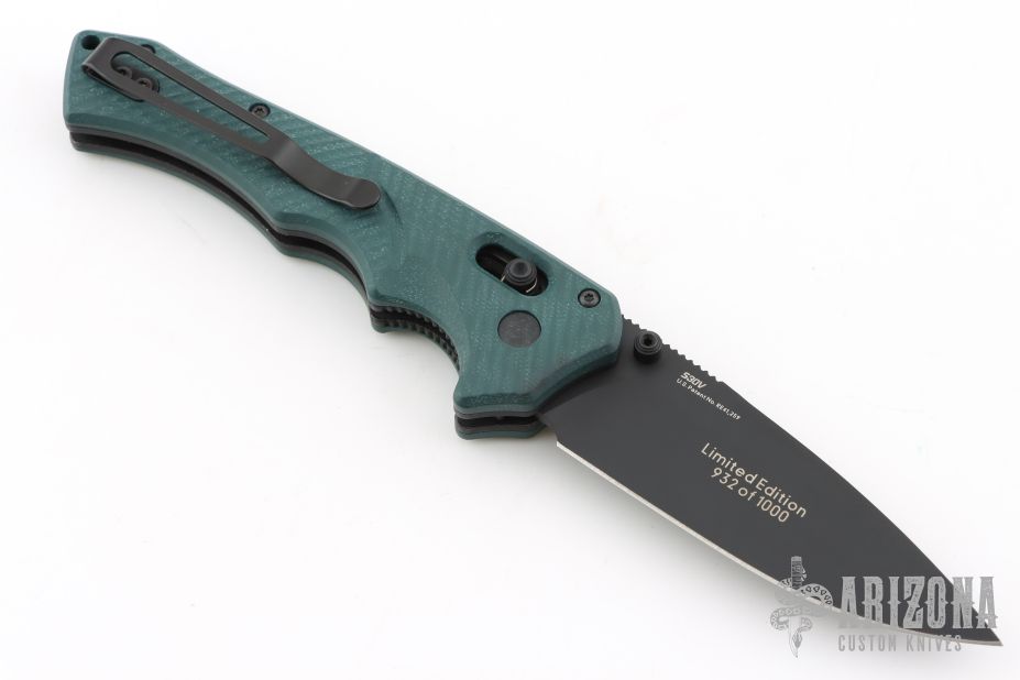 This 615BK-1501 Mini Rukus from Benchmade features a black coated drop point blade with swedge, notched thumb rest and dual thumb studs. The handle is comprised of green G10 over black stainless steel liners and black barrel spacers. Two way tip up carry pocket clip. Features the patented "Axis Lock". Marked "Limited Edition 383 of 1000" on blade. Excellent condition. Consignor mentions that this knife was produced for/from the 2015 SHOT show. Comes with original box and papers.