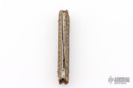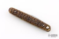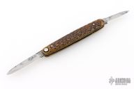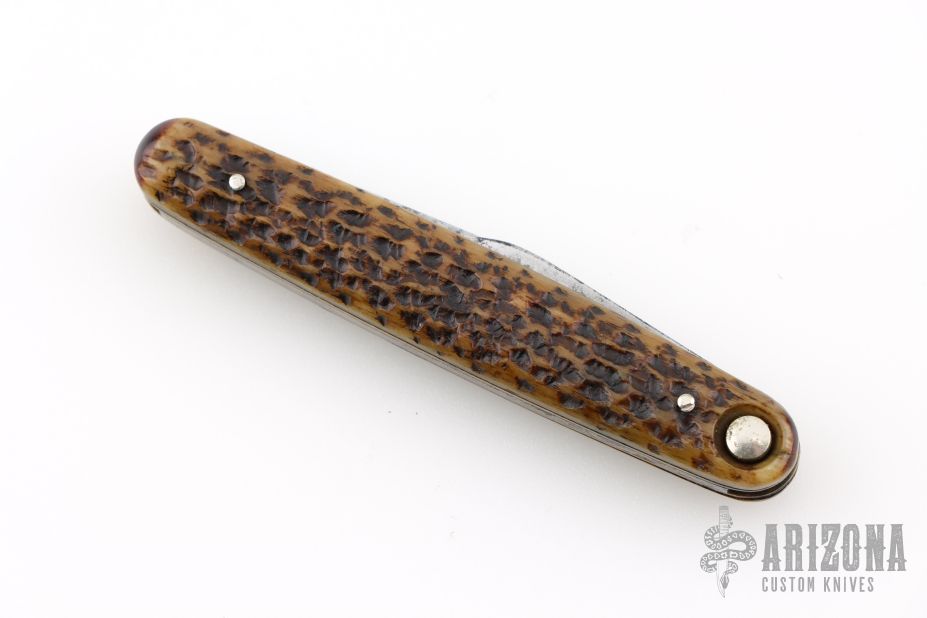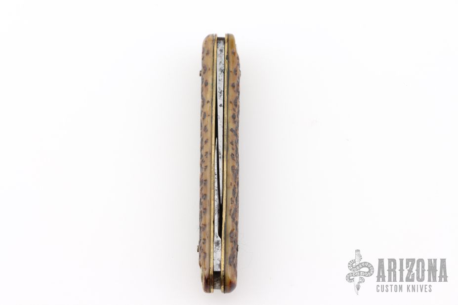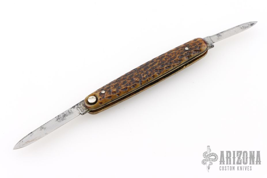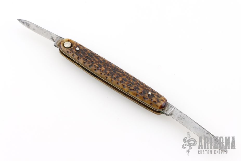 This 2 blade press button auto features 2 blades, one is 1.75" and the other is 1.5". Has jig bone scales with brass liners. Has some scratches and oxidation on the blades. Comes in a soft pouch. One of the blades only fires part way, the other fires strong, but sometimes bounces back. Fair condition