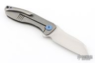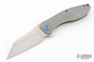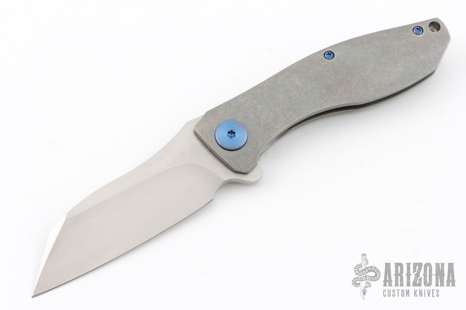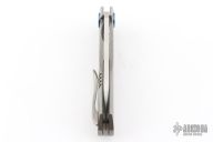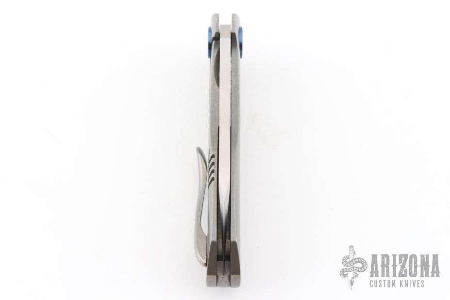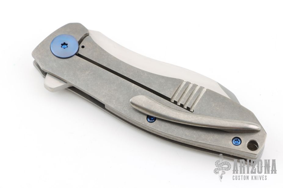 This Collaboration piece by Jim Burke and Jeremy Marsh features hand rub satin finished blade with flipper. The handle features a tumbled titanium frame with matching backspacer and tip up clip with hidden screws. Nice detent, lockup and blade seating. Comes with a zippered case. Excellent condition. Dated 2019