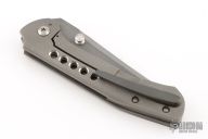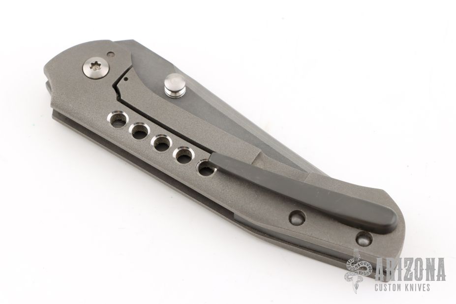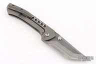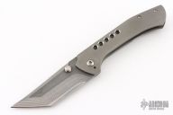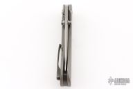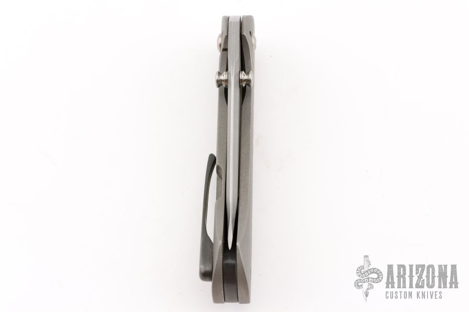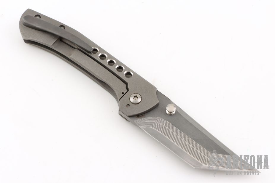 This Primo by Brandon Corbin Steel Wrx features a San Mai Damascus blade with false top edge and dual thumbstuds. The handle has a bead blast finished titanium frame, a zirconium backspacer and tip up clip. Comes with a zipper case. Has scuffs, good condition otherwise.
