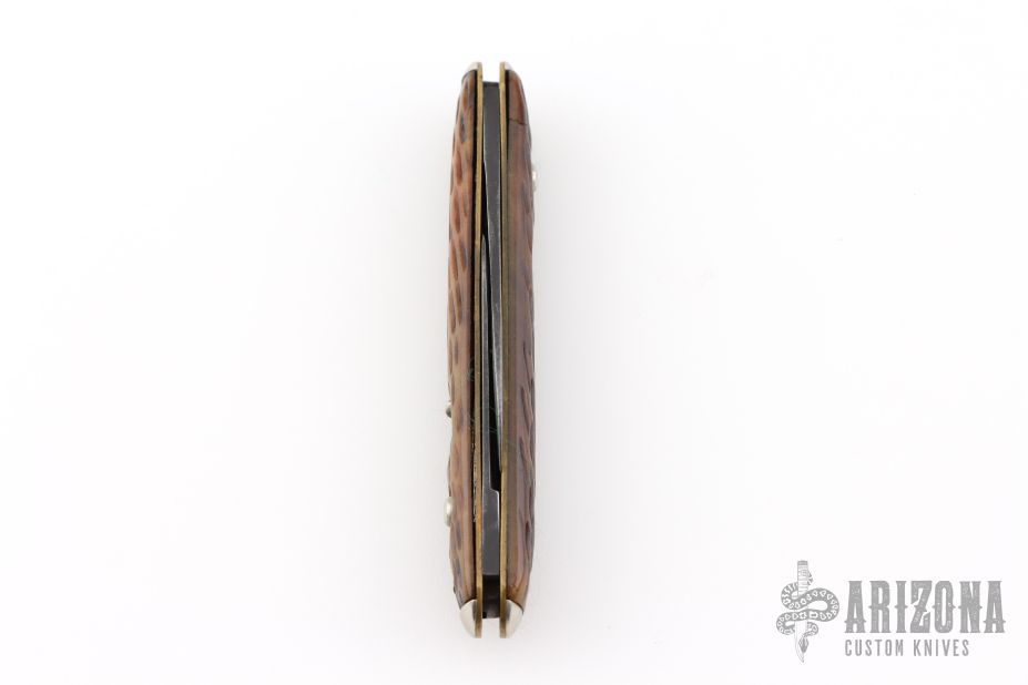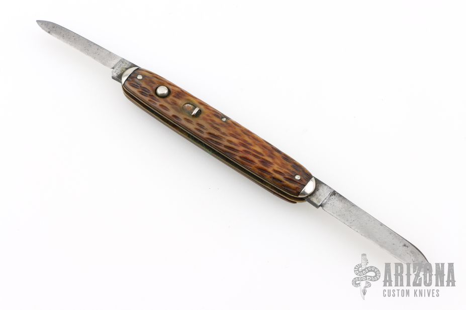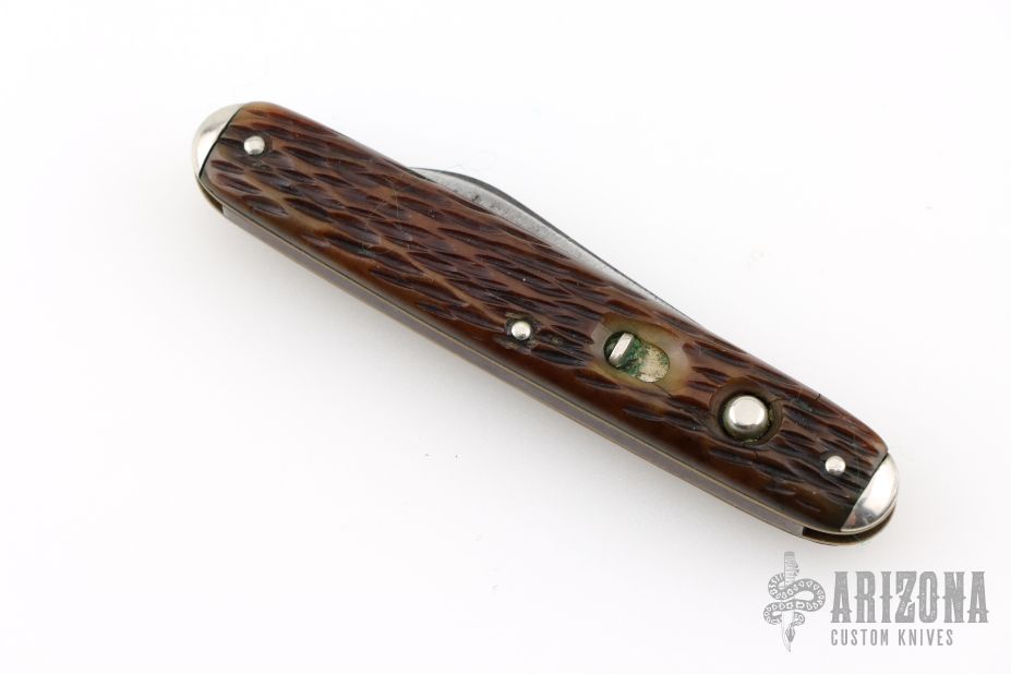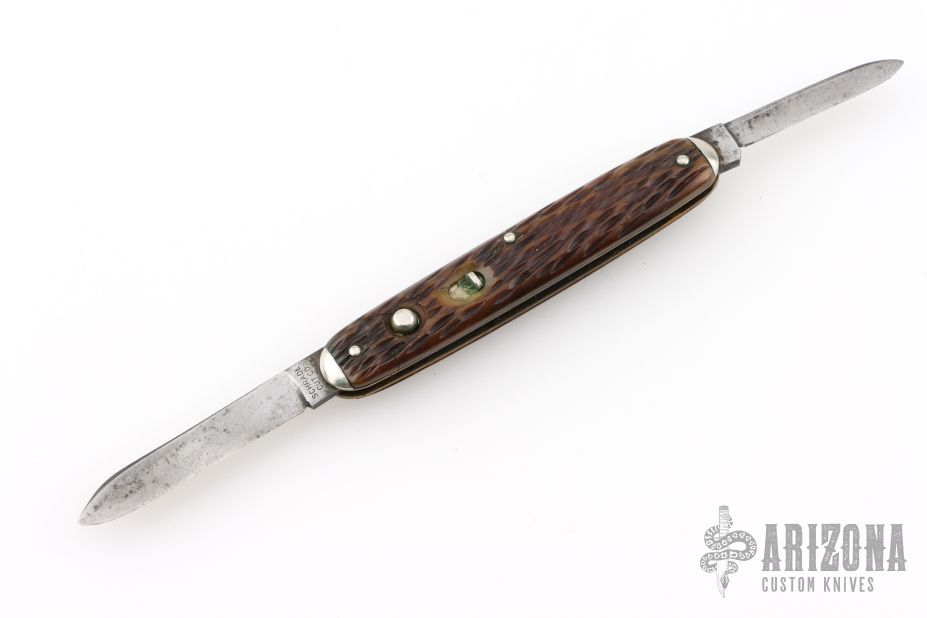This double auto by Schrade features two blades both with their own push button and safety. The handle has jigged bone scales, silver caps, brass liners and steel backspacer. Has some light scratches and patina, otherwise good condition for its age.