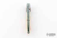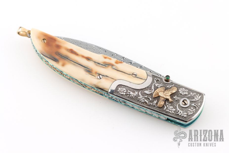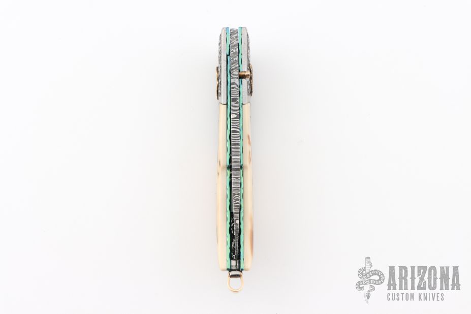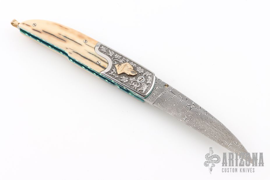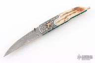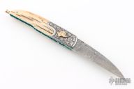 This knife by Stephen Olszewski features a Damascus blade with a single thumbstud green stone inlay. The handle has Engraved Damascus bolsters, anodized titanium liners with fileworked spines, carved and fileworked Damascus backspace, heirloom fit mastodon covers, gold accents and bail. Has nice detent and blade seating, and lockup. Has a couple of light scratches otherwise the knife is in Excellent condition.