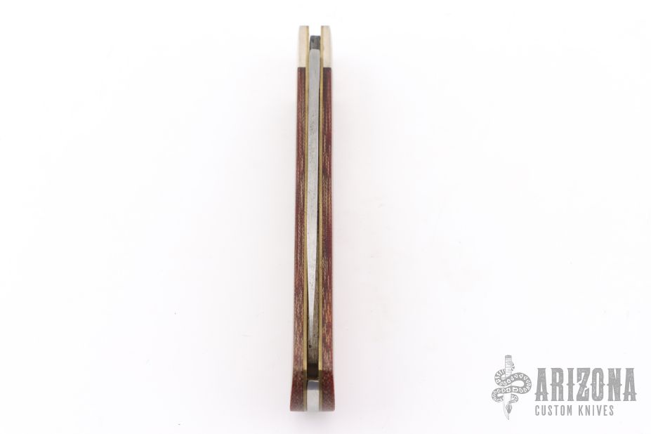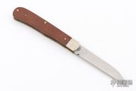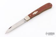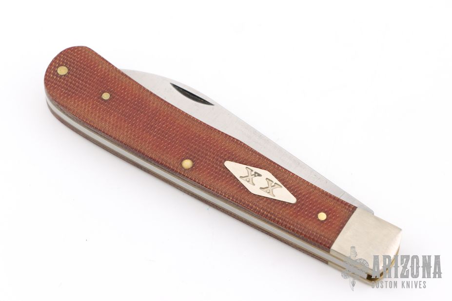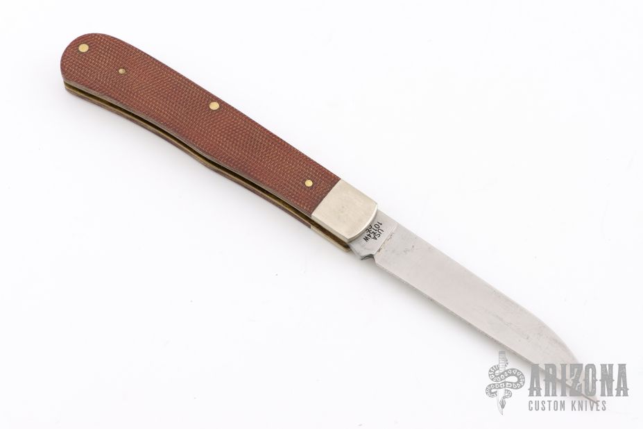 This Barehead Trapper by Case features a satin finished blade with nail nick. The handle has nickel silver bolsters, natural canvas micarta scales, with a XX nickel silver shield, brass liners and stainless spring. Comes with original box and papers. Has a couple light scratches, otherwise excellent condition.