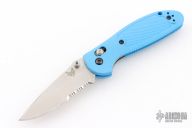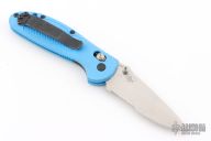 This Mini Griptilian by Benchmade features a stonewashed partially serrated blade with notched thumbrest and dual thumbstuds. The handle has blue FRN scales with stainless steel liners and black tip up reversible clip.