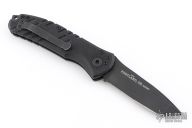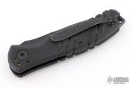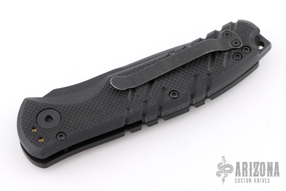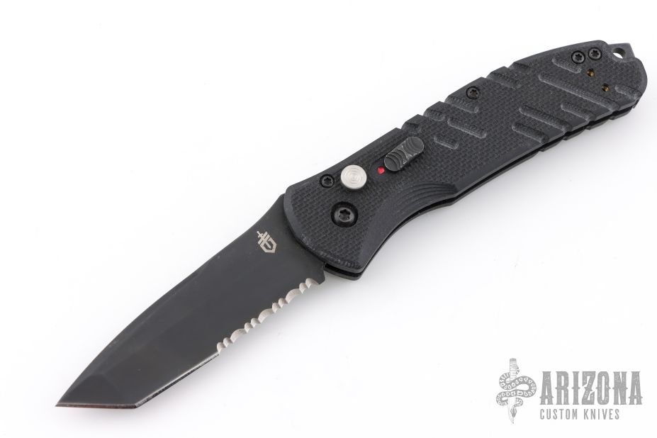 This Tanto by Gerber features a partially serrated black coated blade with push button and safety. The handle has milled black G-10 scales and a 3-way stainless steel clip. Has some scuffs, otherwise good condition.
