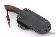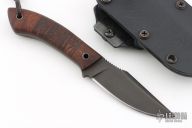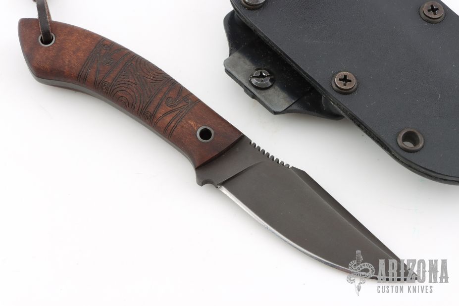 Jason Knight Design by Winkler Knives. Black blade with notched thumbrest, .162" blade stock and .977" blade depth, full tang construction. The handle has tribal pattern maple scales. Comes with original box, sheath and papers. Has scuffs and scratches on the blade, great condition otherwise.