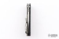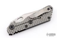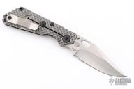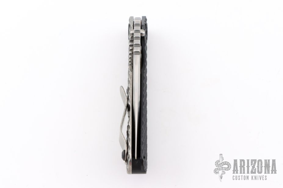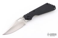 This SNG DGG by Strider has a satin/stonewash finished Bowie blade with dual thumb studs, thumb hole, and notched thumb rest. Handle has a black G-10 and bead blasted titanium "Gunner Grip", lockbar stabilizer, and titanium tip up clip. Nice detent, lockup and blade seating. Excellent condition.