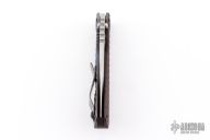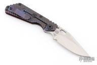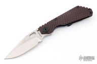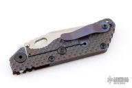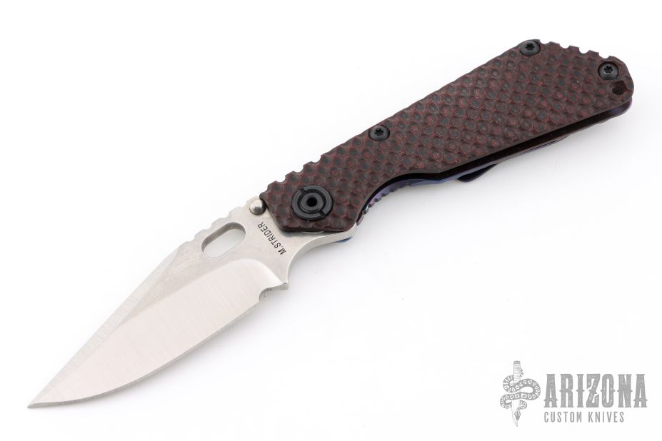 This SNG DGG by Strider has a satin/stonewash finished Bowie blade with dual thumb studs, thumb hole, and notched thumb rest. Handle has a black/red G-10 and anodized titanium "Gunner Grip", lockbar stabilizer, and titanium tip up clip. Nice detent, lockup and blade seating. Excellent condition.