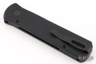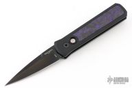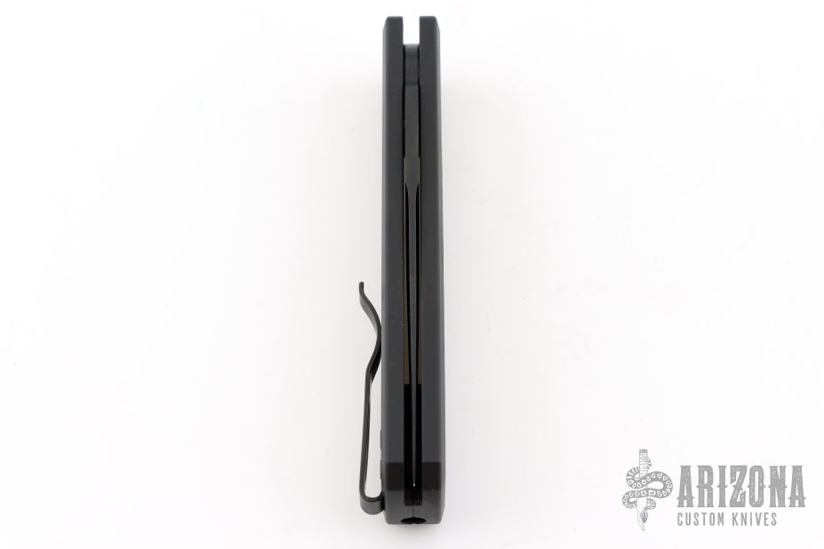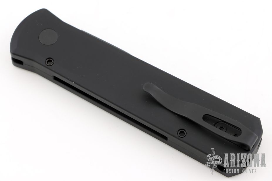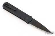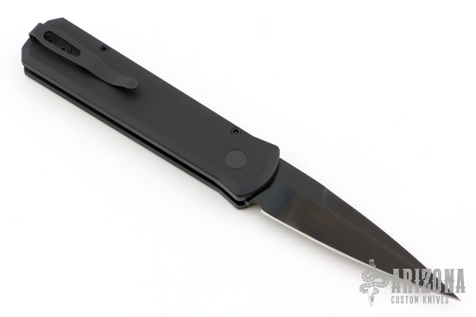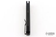 This side opening auto features a black spear point blade with a false top edge. The handle has a black aluminum frame with carbon fiber scales and a black stainless steel clip, tip up carry.  Black-lip pearl inlaid push button. Comes with original box and papers. New from maker!